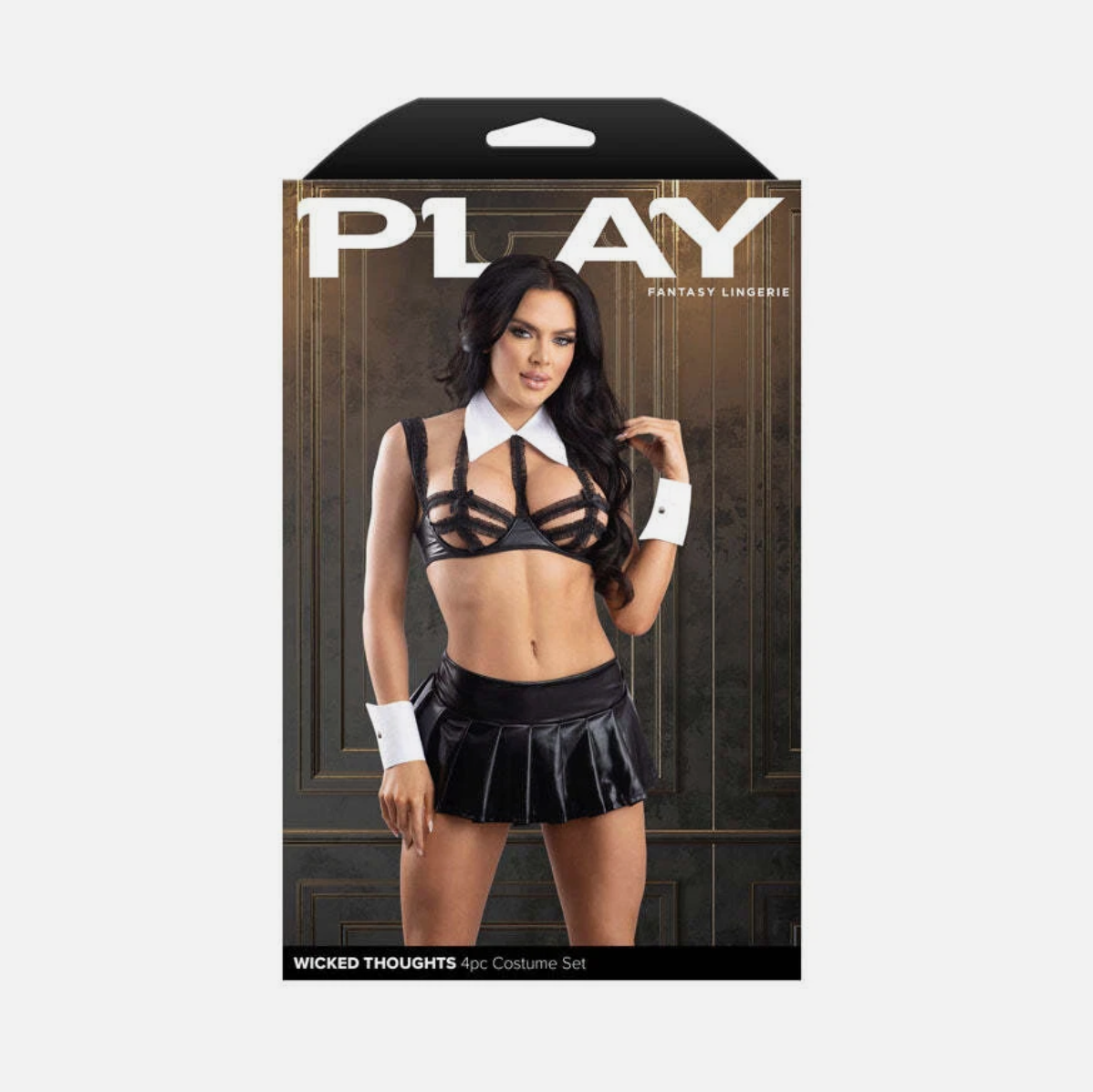 Collared Strappy Ruffled Elastic Bra, Skirt, Panty and Wrist Cuffs with Snap Button Detail.