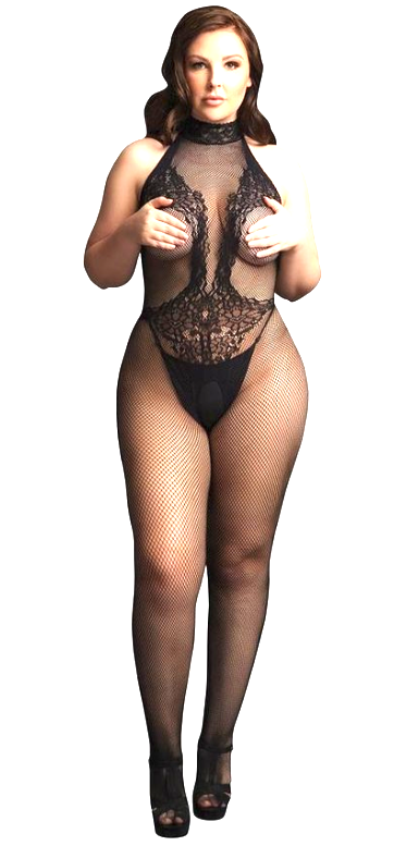 This black bodystocking is crafted from a combination of lace-pattern and fishnet. It also features a halter neck and open crotch, need we say more? This bodystocking has a lot of stretch and fits most curves. Hand wash cold line dry. Never iron, bleach or dry clean. Thong not included. 92% nylon, 8% spandex