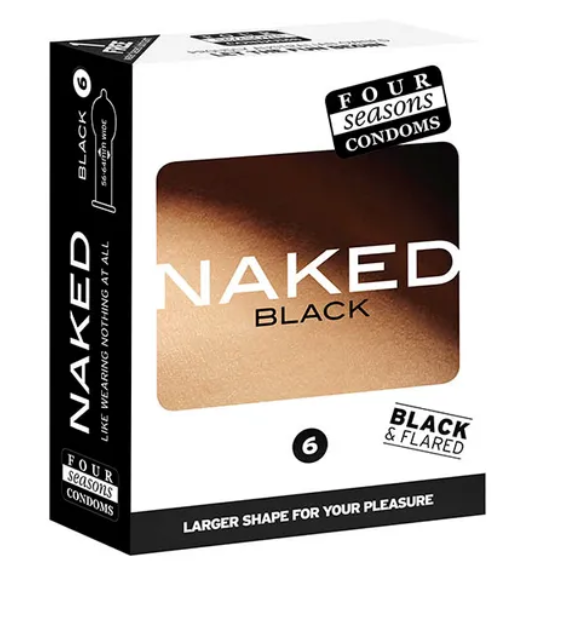 The Naked Black Condoms by Four Seasons is a larger condom with a unique flared shape head for increased comfort and pleasure.