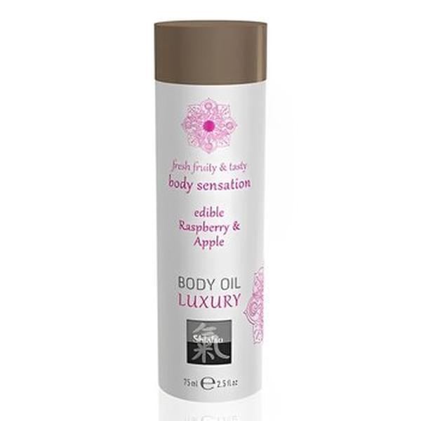 Indulge in a sensual experience with SHIATSU 2.5 oz Luxury Body Oil Edible in Raspberry & Apple flavor. This edible massage oil is designed to awaken desire and passion, offering an aphrodisiac sensory party. Made from natural essential oils, it pampers and smoothens the skin while tantalizing your senses with the delicious scent of apple and raspberry. Let your desires run wild with this luxurious massage oil.