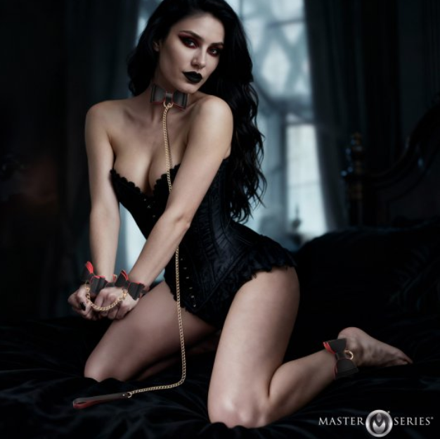 Gothic Style: The collar and cuffs all have black and red bows with gold metal D-rings that match the gold chain leash and cuff connectors.