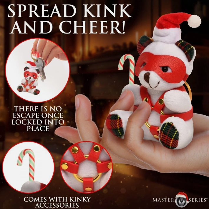 - Kink Accessories: This adorable little bear plays a Dominant role with a mask, harness, and a wicked-looking candy cane as kinky accessories!