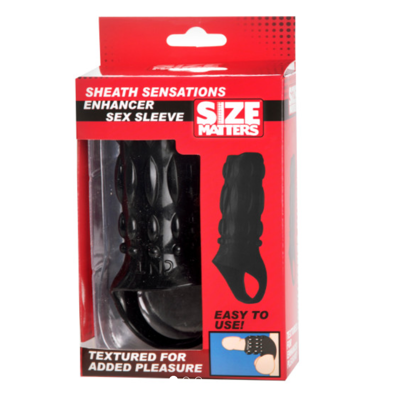 The Size Matters Sheath Sensations Enhancer Sex Sleeve in black is designed to provide a subtle girth boost for enhanced pleasure. This sex sleeve comes with an extra strap for additional enhancement and a secure fit. Please note that the dildo is not included. Ideal for spicing up intimate moments, this enhancer sex sleeve is a must-have for those looking to explore new sensations.